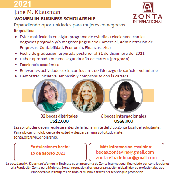 Desde abril hasta junio estará disponible la convocatoria de postulación a la Beca Jane M. Klausman Women in Business, consistente en apoyos monetarios para que las mujeres se formen profesionalmente superando así las barreras de género y su poca presencia como líderes en el rubro empresarial y de los negocios.