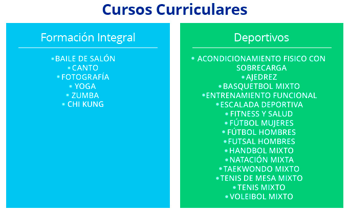 “Cursos Libres” es el nombre que reciben las asignaturas deportivas, de ejercicios físicos y de formación integral (expresión corporal, música y baile), que están insertas en cada una de las mallas curriculares de las 3 carreras que la Facultad imparte.