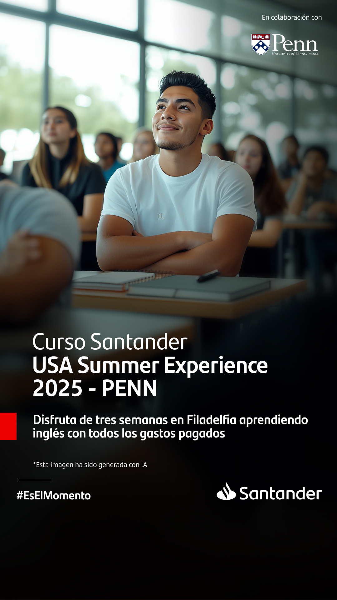 Santander Open Academy en colaboración con la Universidad de Pennsylvania. Se trata del Curso Santander USA Summer Experience 2025 – PENN. Un programa presencial intensivo de inglés que se llevará a cabo en Filadelfia, Estados Unidos, entre el 14 de julio y el 1 de agosto de 2025. El programa tiene una duración de 3 semanas e incluye: pasajes de avión, alojamiento y manutención durante toda la estadía.