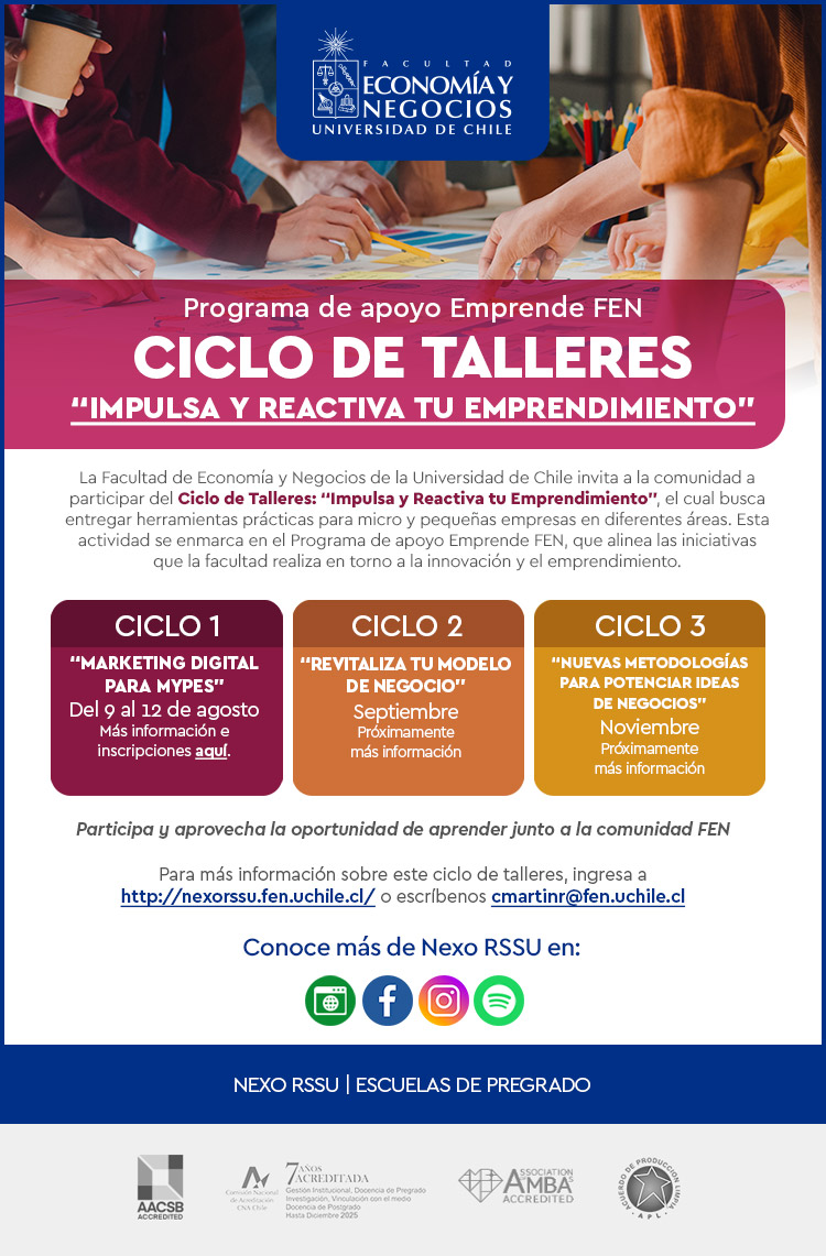 Durante el semestre de primavera, la unidad de Nexo Responsabilidad Social y Sustentabilidad Universitaria (RSSU) junto al programa Emprende FEN, cuyo objetivo es potenciar el desarrollo de competencias emprendedoras en los y las estudiantes, realizarán un ciclo de talleres para micro y pequeños/as emprendedores, en busca de entregar herramientas en diferentes áreas. “Impulsa y Reactiva tu Emprendimiento” se compone de tres instancias temáticas abiertas a la comunidad FEN, y a socios/as emprendedores que se han vinculado/a a FEN a través de distintas iniciativas previas.